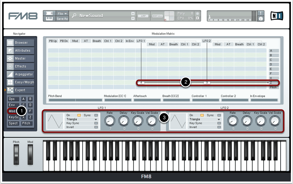 Wir begeben uns zum Menüpunkt “Mod”, um die LFO-Settings festzulegen (1).