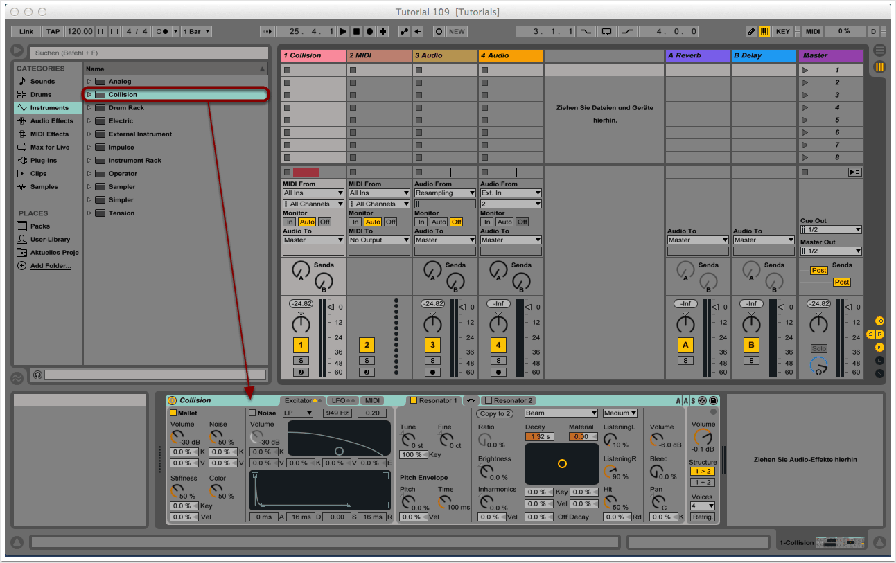 Im Instrumenten-Ordner wählen wir Collision aus und ordnen den Synthesizer per Drag&Drop einer freien MIDI-Spur zu.