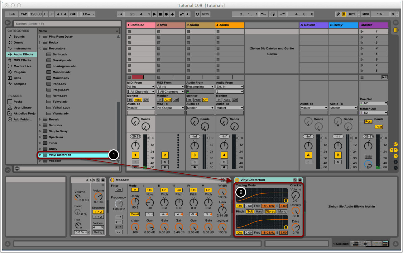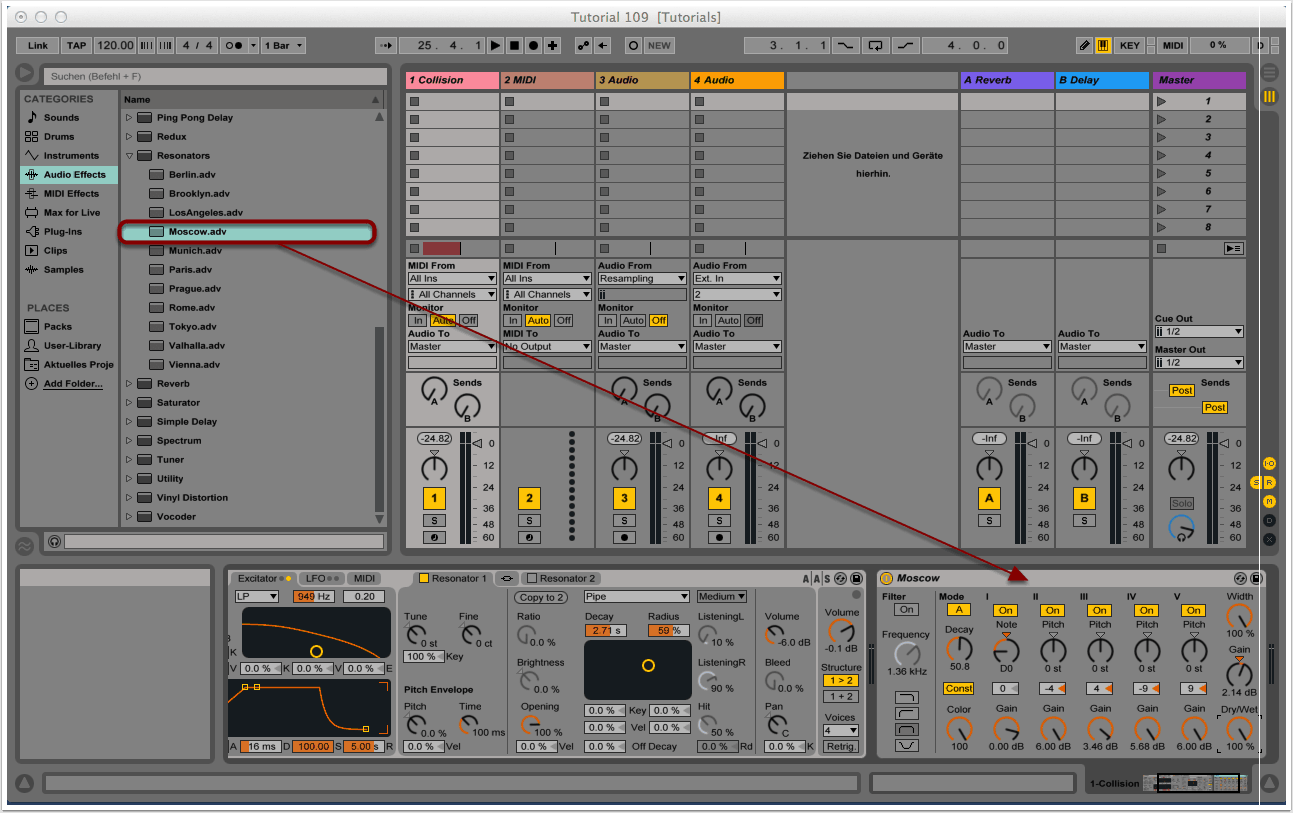 Als ersten Effekt wählen wir das Resonator-Preset “Moscow” aus dem Audio-Effects-Menü aus und ziehen es per Drag&Drop direkt neben den Synthesizer.