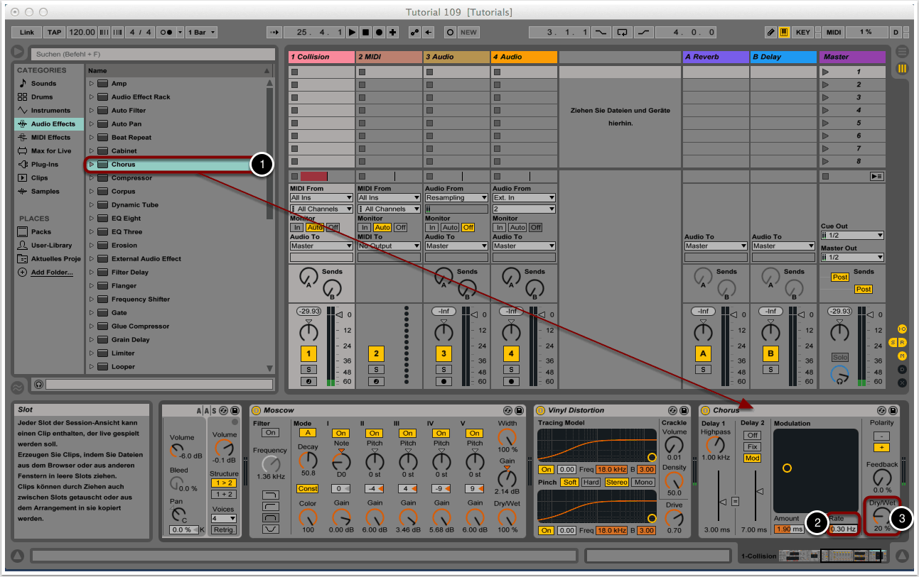 Als nächsten Effekt wählen wir “Chorus” aus und fügen das Modul auf der rechten Seite hinzu (1).