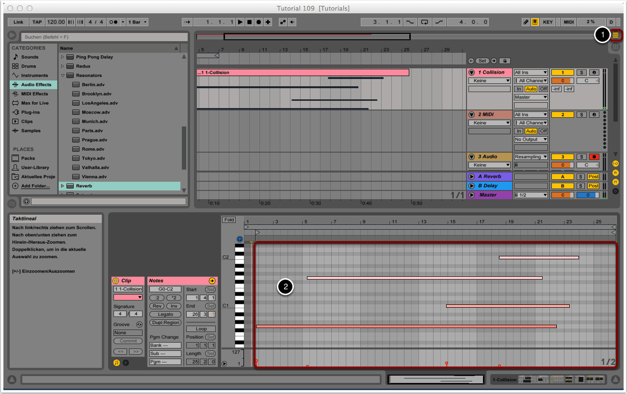 Um eine MIDI-Sequenz zu erzeugen, wechseln wir zur Arrangement-Ansicht (1).