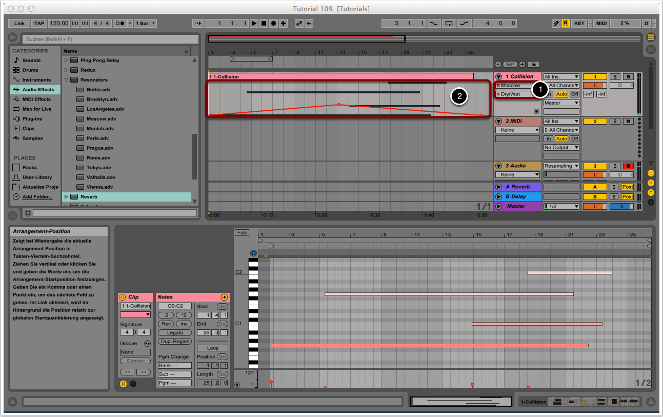 Als ersten Parameter wählen wir die Grenzfrequenz des Low-Pass-Filters von Collision aus (1).