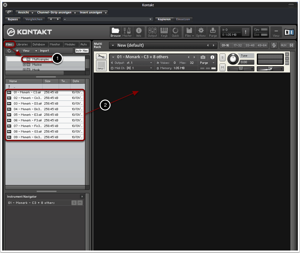 Wir laden den Kontakt-Sampler und rufen über das Files-Menü auf der linken Seite den Ordner mit den Multisamples auf (1).