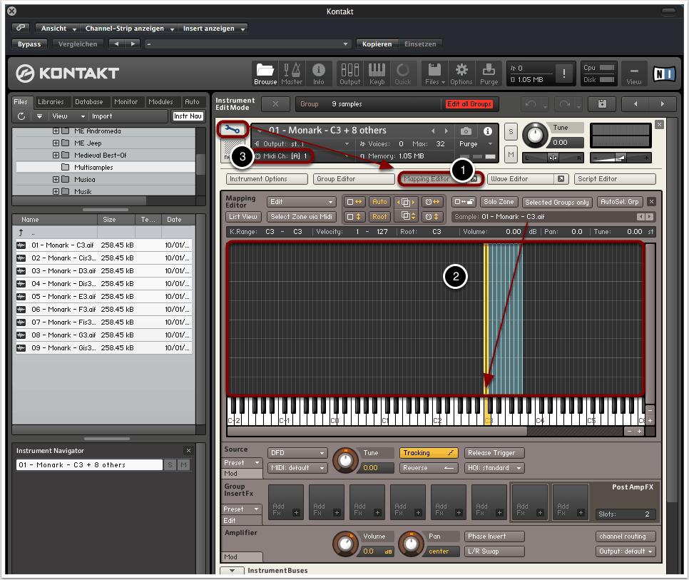 Mit einem korrekt angeschlossenen MIDI-Keyboard können die gemappten Samples jetzt abgespielt werden. Unter Umständen muss der MIDI-Channel auf “omni” gestellt werden (3).