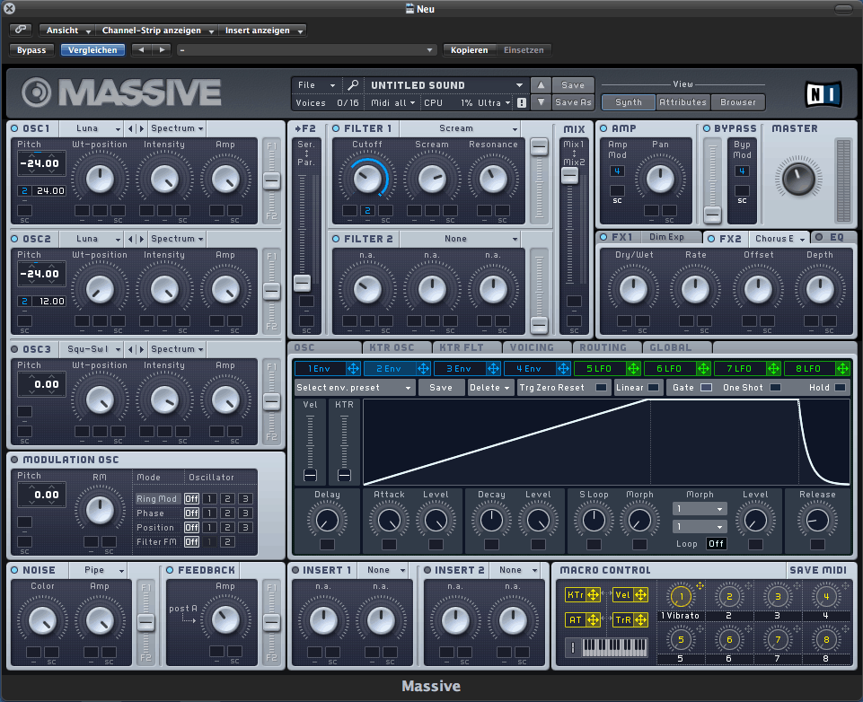 In diesem Tutorial wollen wir mit Native Instruments Massive aggressive Risers und Build-ups mit Tremolo-Charakter erstellen. Bei dem Klangbeispiel handelt es sich um drei Varianten des gleichen Ausgangspatches mit unterschiedlichen Tonhöhen. Wir wollen euch Schritt für Schritt zeigen, wie wir diesen Patch mit Massive erstellt haben.