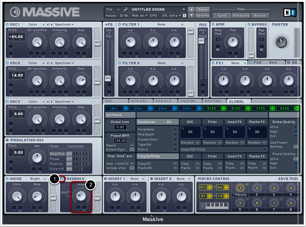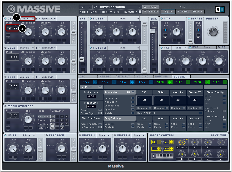 Der erste Oszillator soll das Fundament unseres Bass Sounds liefern, daher transponieren wir diesen um zwei Oktaven nach unten (2).