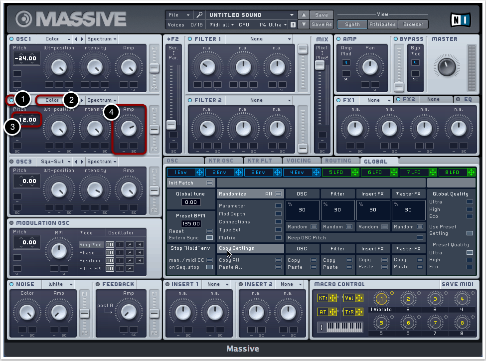 Dieser Oszillator soll uns die hohen Frequenzanteile liefern. Wir transponieren Oszillator 2 um eine Oktave nach oben (3).