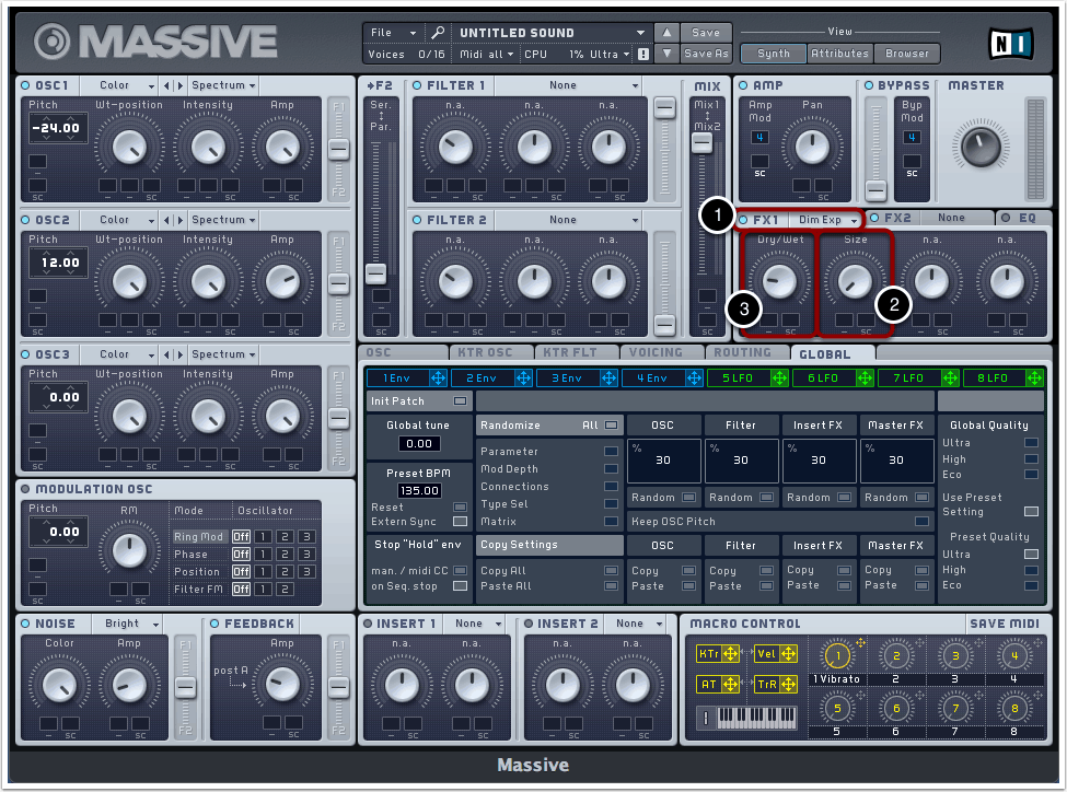 “4 Env” ist per Default die Hüllkurve, mit der die Master-Volume von Massive gesteuert werden kann (1).