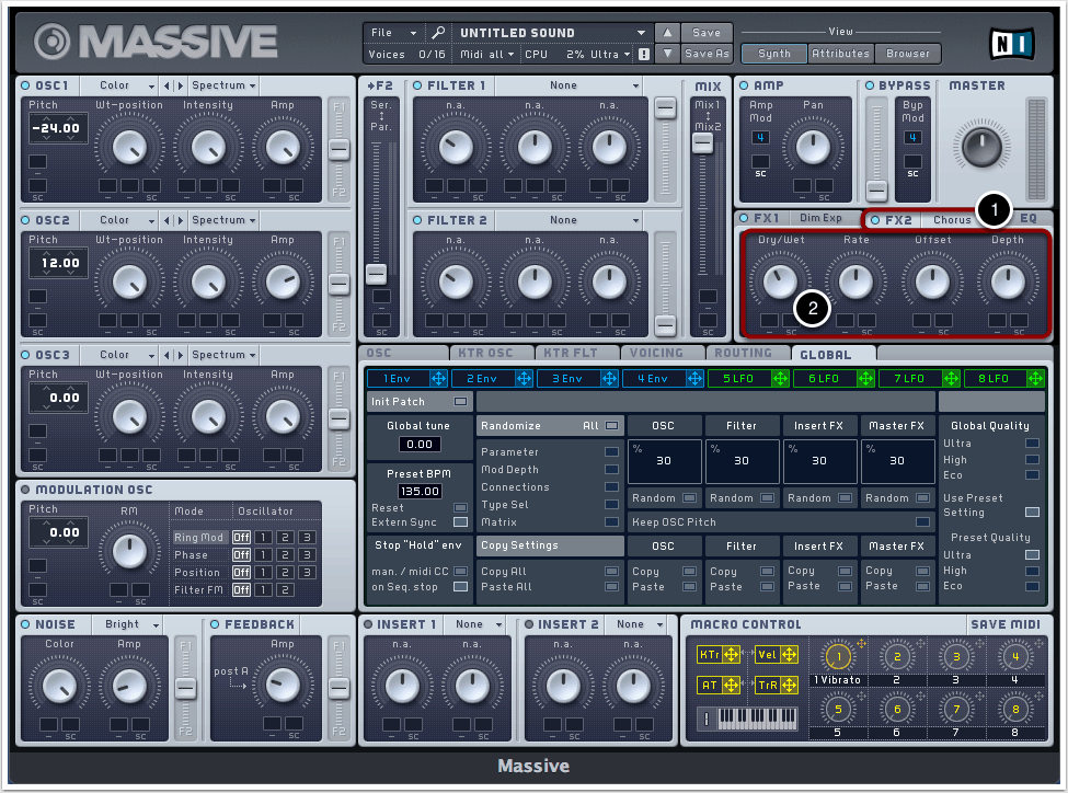 Wir wählen “Chorus” oder “Chorus Ensemble” als zweiten Effekt aus (1).