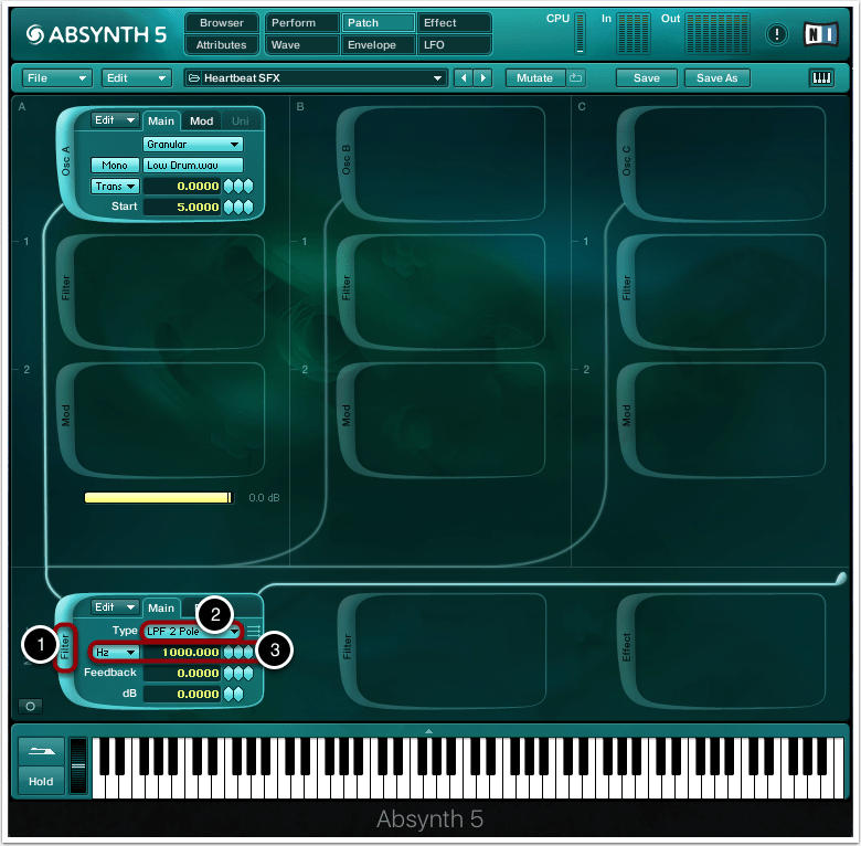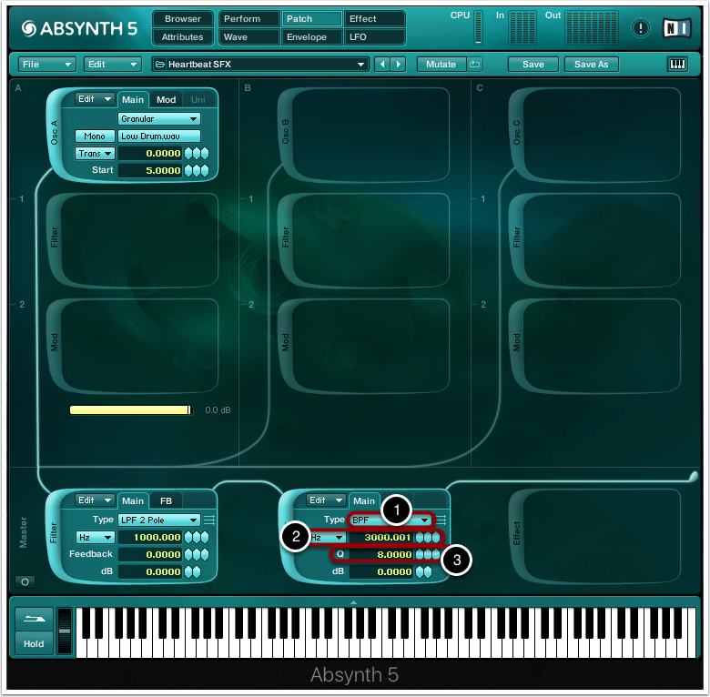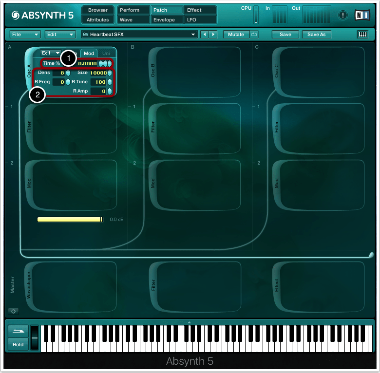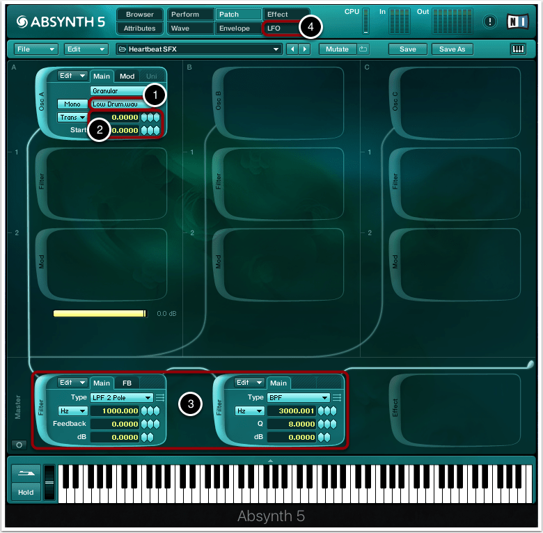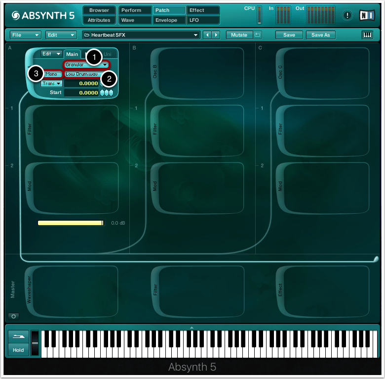 Probeweise können wir über die virtuelle Tastatur an der unteren Seite von Absynth einen Klang abspielen, der bisher jedoch noch nicht viel mit einem Herzschlag-SFX zu tun hat. Sollte nichts zu hören sein, kann im Oszillator-Menü “Main” der Startpunkt des Samples verändert werden.