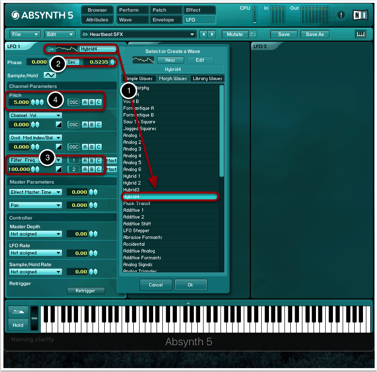 Wir begeben uns in das LFO-Menü und wählen eine beliebige Wellenform aus. Für unser Klangbeispiel haben wir z.B. “Hybrid4” verwendet (1).