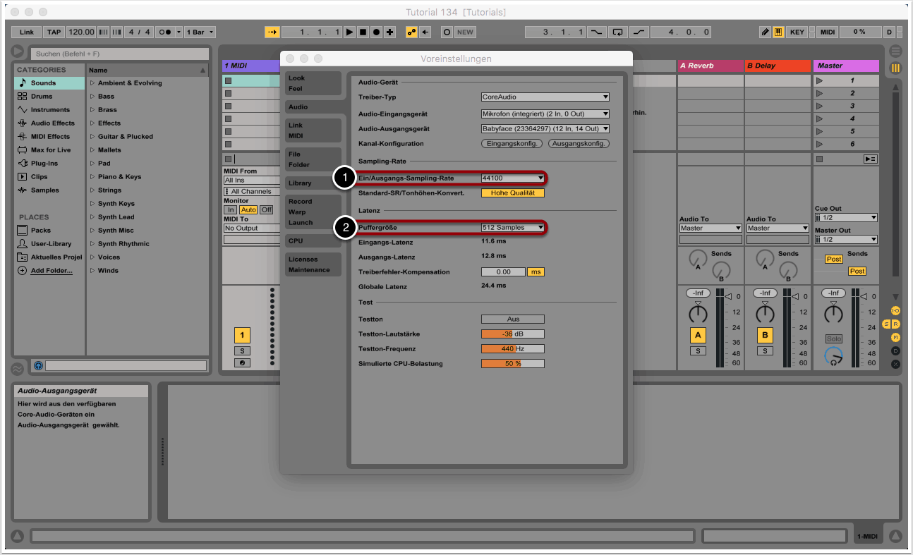 Auch die Puffergröße kann einen Einfluss auf die Performance haben. Je größer diese ist, desto niedriger ist in der Regel die CPU-Belastung. Allerdings vergrößert sich mit einer höheren Puffergröße auch die Latenz, was insbesondere bei Live-Performances zu Kommunikationsproblemen zwischen MIDI und Ableton Live führen kann (2).