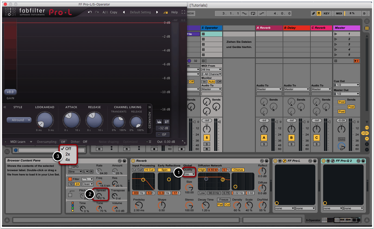 Je nach Setting unterscheiden sich bei fast allen Plug-ins deren CPU-Beanspruchung. Beispielsweise wird bei der Oversampling-Funktion von FabFilters Limiter Pro-L mehr Rechenleistung benötigt (3). Oft sind die Unterschiede jedoch so geringt, dass eine CPU-Optimierung zu vernachlässigen ist. Dennoch sollte beim Erwerb neuer Audio-Tools ein Blick in das Benutzerhandbuch geworfen werden, um festzustellen, ob und in wie fern Rechenleistung gespart werden kann.