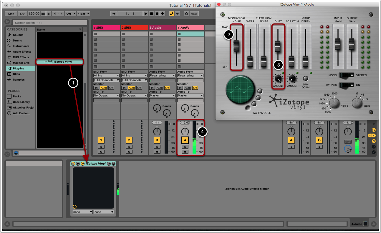 Links im Plug-ins-Menü wählen wir iZotope Vinyl aus und ziehen das Modul auf eine freie Audiospur (1).
