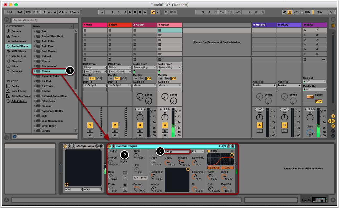 Die stärkste Klangmanipulation erzeugen wir direkt mit dem ersten angewendeten Effekt: Wir wählen “Corpus” aus dem Audio-Effects-Menü aus und ziehen das Modul rechts neben Vinyl in den Audio-Effects-Slot (1).