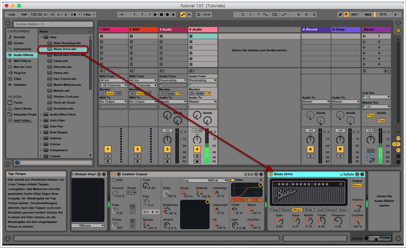 Aus dem Drop-Down-Menü wählen wir das Preset “Blues Drive” aus und ziehen es rechts neben das Corpus-Modul. Die Default-Einstellungen können beibehalten werden.