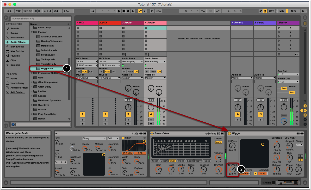 Um mehr Modulation in den Sound zu bekommen und den Stereoeindruck zu vergrößern, wählen wir das Flanger-Preset “Wiggle” aus und fügen es der Effekt-Chain hinzu (1).
