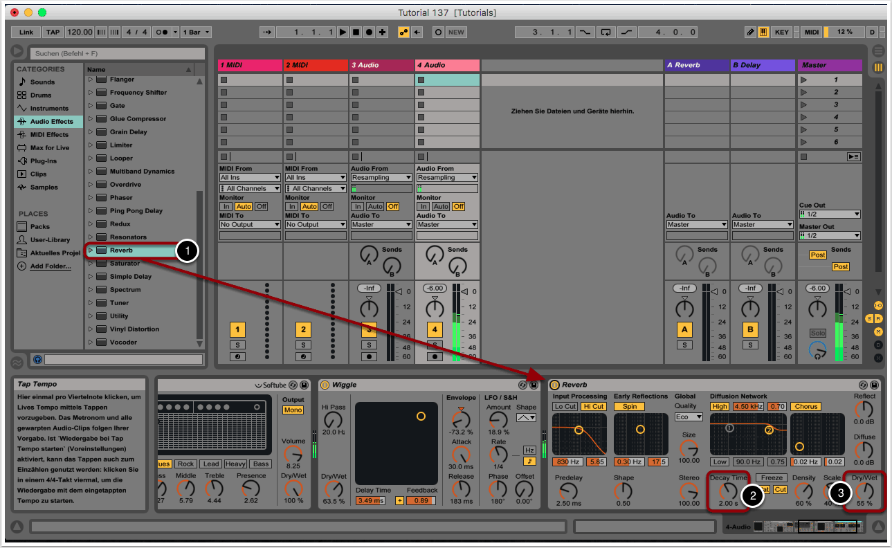 Wem der Reverb-Anteil zu hoch ist, kann das Dry-/Wet-Verhältnis ein wenig reduzieren (3).