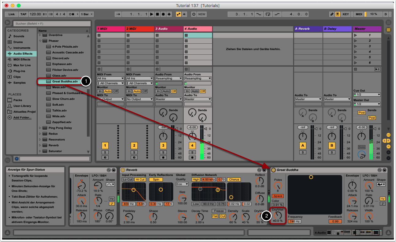 Das Dry-/Wet-Verhältnis reduzieren wir auf etwa 40% (2).