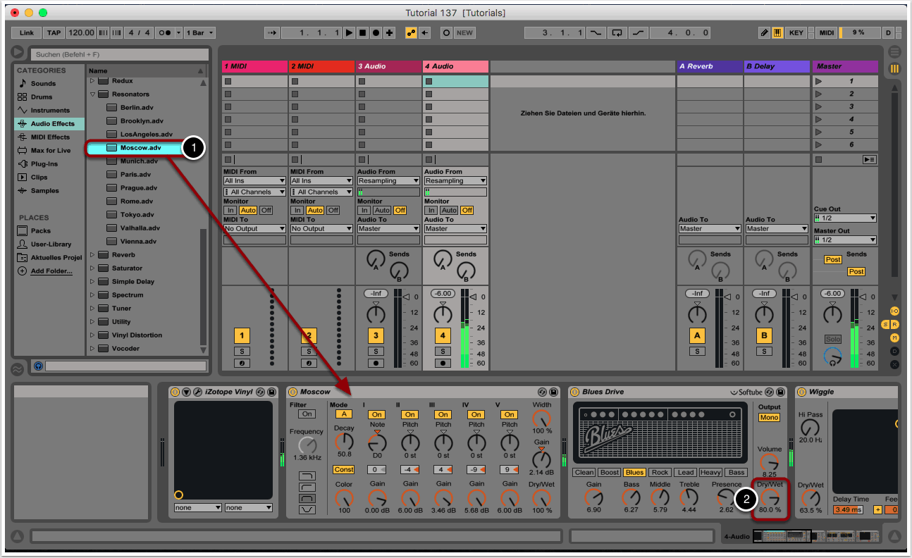 Bei dem zweiten Klangbeispiel haben wir Corpus durch das Resonators-Modul ersetzt. Hierzu entfernen wir zunächst das Corpus-Modul und fügen anschließend das Preset “Moscow” and die gleiche Stelle in der Effekt-Chain hinzu (1).