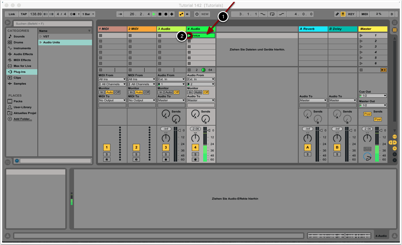 Per Drag&Drop ziehen wir das Quellsample – das Carrier Signal -, welches wir mit dem Vocoder bearbeiten möchten, in eine freie Audiospur (1).
