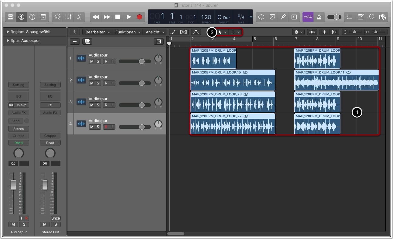 Sehr einfach lassen sich in Logic X mehrere Regionen gleichzeitig verschieben, schneiden und von der Länge her anpassen. Hierzu müssen die zu bearbeitenden Regionen lediglich markiert werden. Mit dem Befehl Cmd+A können wir alle im Projekt vorhandenen Regionen markieren (1).