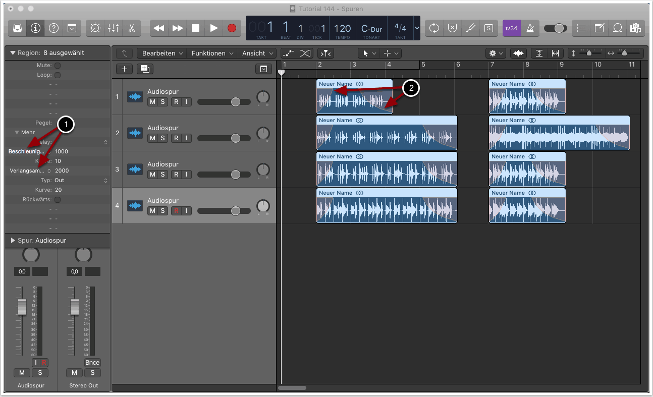 Neben “Fade-In” und “Fade-Out” können wir Werte eintragen, die der Dauer der Fades der ausgewählten Regionen in Millisekunden entsprechen (1).