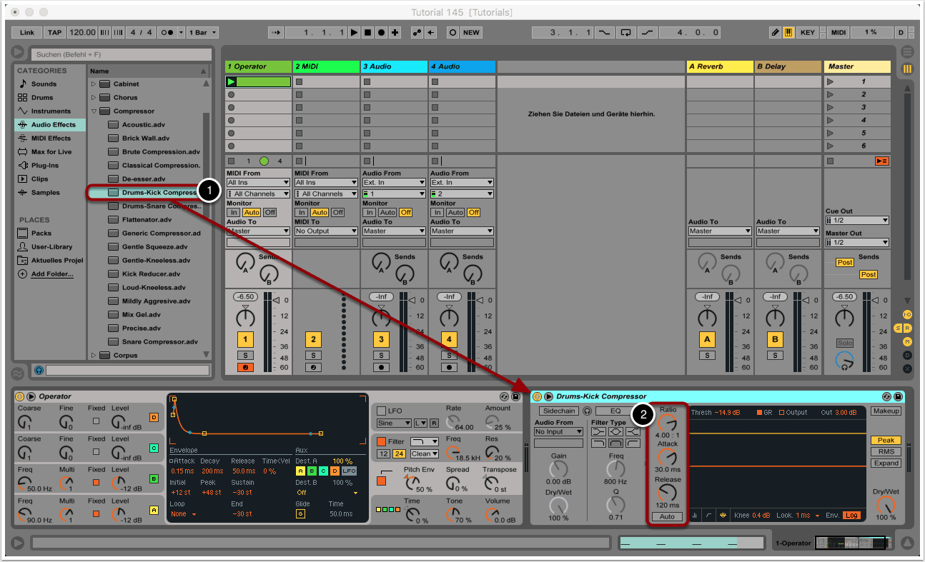 Für etwas mehr Punch fügen wir einen Kompressor aus dem Audio-Effects-Menü hinzu. Für unsere Klangbeispiele haben wir das Preset “Drums-Kick Compressor” verwendet (1).