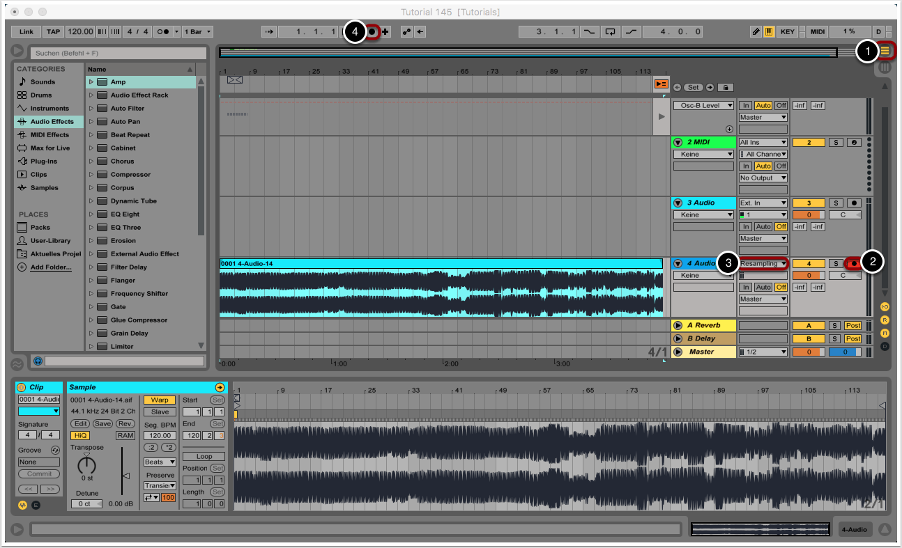 Durch Aktivieren der Arrangement-Aufnahmetaste starten wir die Aufnahme (4).