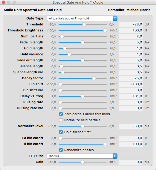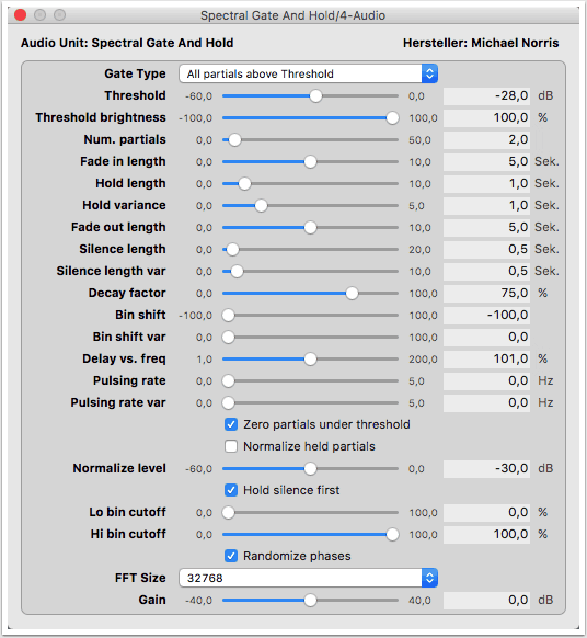 Sofern bei der Installation alles richtig gemacht wurde, finden wir Spectral Gate and Hold in der Rubrik Plug-ins -> Michael Norris. Neben diesem Plug-in gibt es noch eine ganze Reihe weiterer Tools, die es sich ebenfalls lohnt auszuprobieren. In SOS Tutorial 095 haben wir bereits einen Überblick über Spectral Drone Maker gegeben.