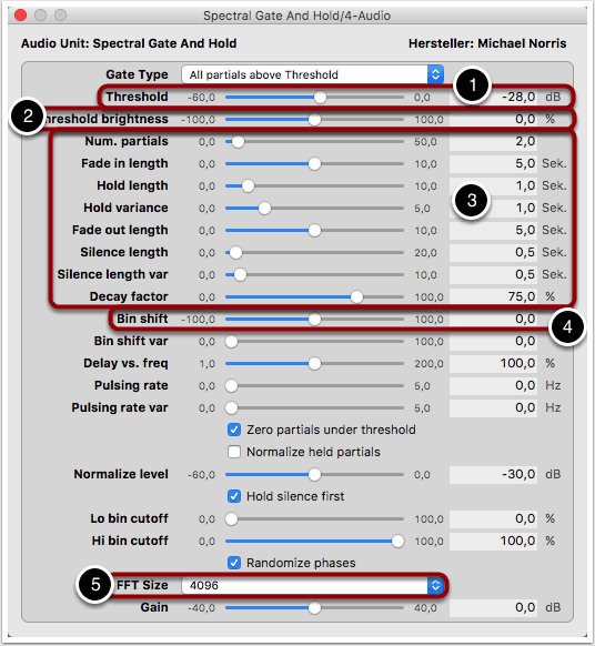 – FFT Size: Damit kann indirekt die Tonhöhe der gesamten Soundscape festgelegt werden. Der Wert wird in Samples angegeben (5).