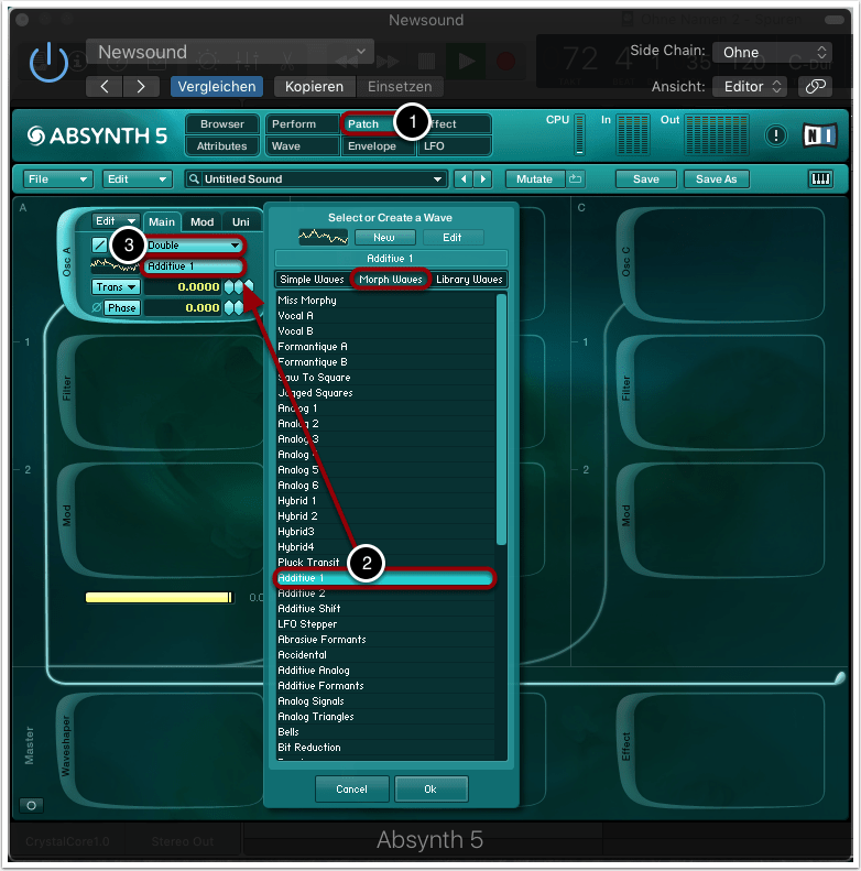 Als Wellenform wählen wir “Additive 1”. Achtung: Diese Wellenform ist in der Library zweimal vorhanden! Wir benötigen die Wellenform aus der Rubrik “Morph Waves” (2).