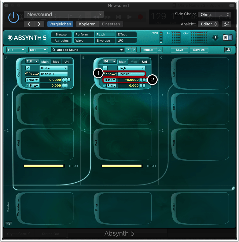 Wir aktivieren Oszillator B und wählen auch hier “Additive 1” als Wellenform aus (1).