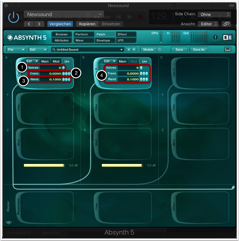 Wir verstimmen die Voices leicht gegeneinander, indem wir den Wert “Rand” auf 0.1 erhöhen (3).
