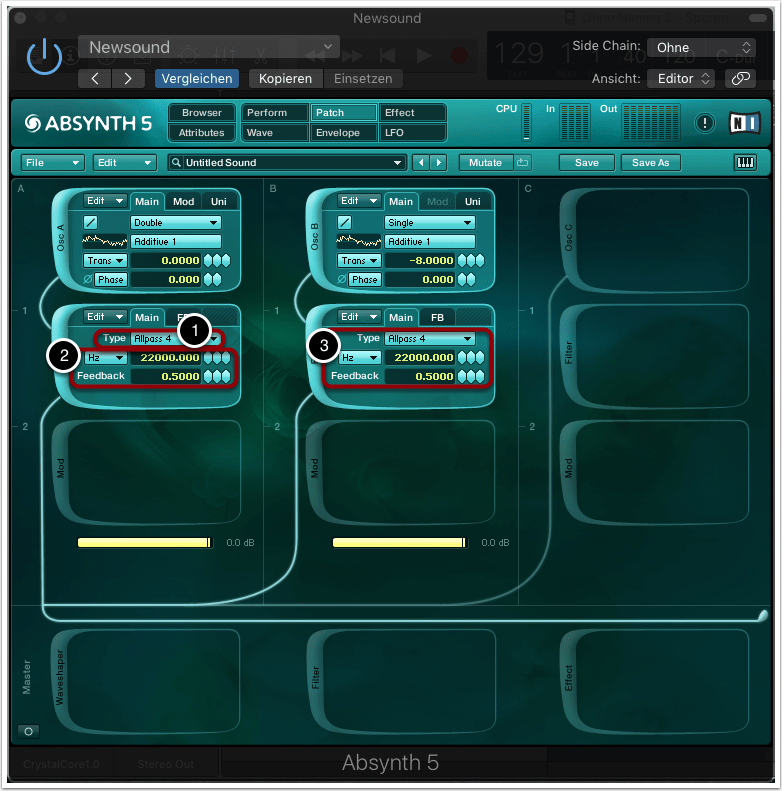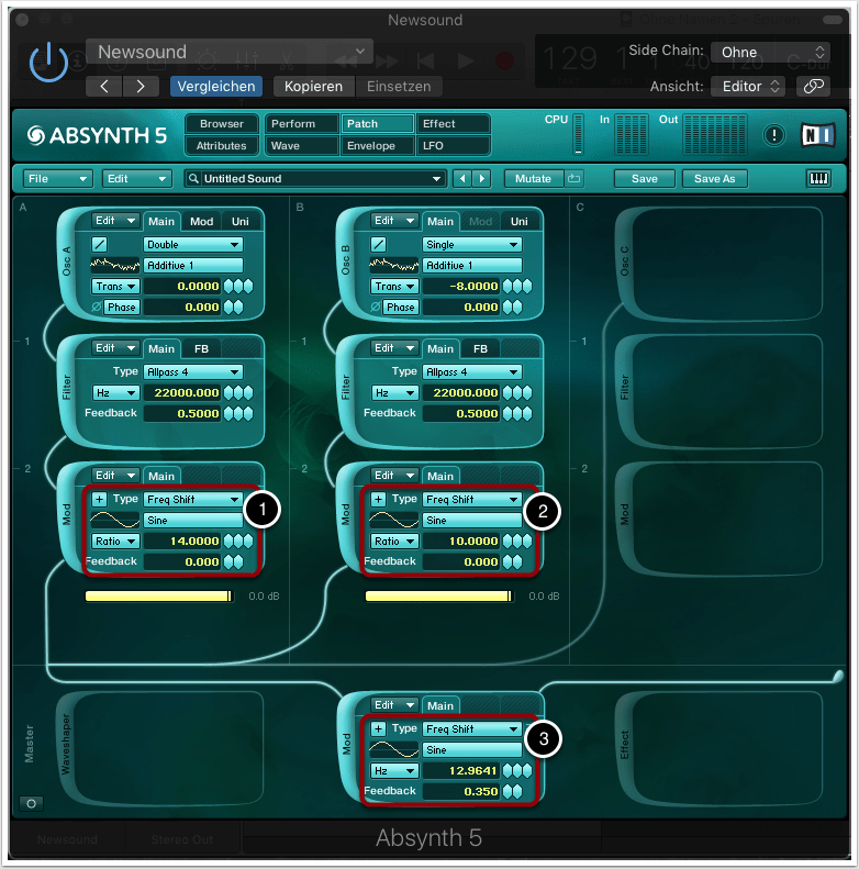 Die gleichen Settings übertragen wir auch auf das Modul von Oszillator B (3).