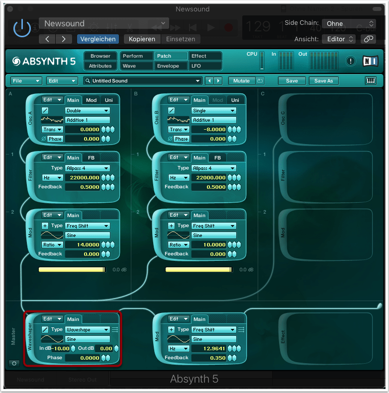 Für etwas Distortion aktivieren wir das Waveshaper-Modul in der Master-Sektion und reduzieren den Input auf -10dB.