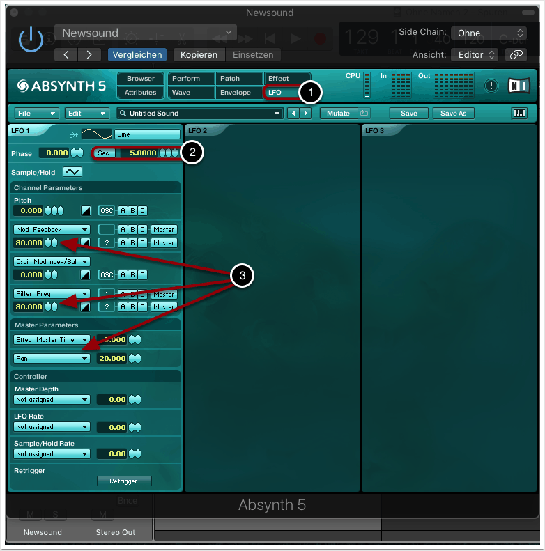 Als Modulationsparameter wählen wir “Mod Feedback”, “Filter Freq” und “Pan” aus. Die Modulationstiefen zwischen 0 und 100% können übernommen oder nach Belieben verändert werden (3).