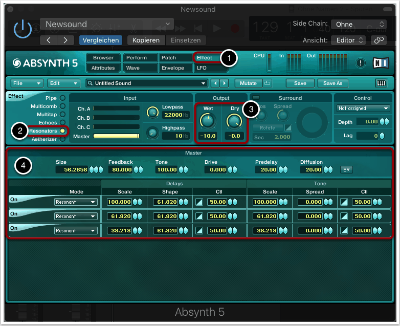 Die Resonator-Settings können aus der Abbildung übernommen oder angepasst werden (4).