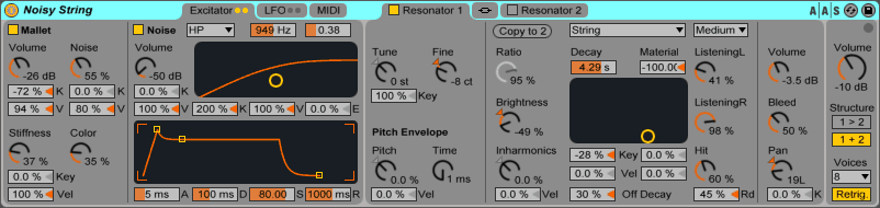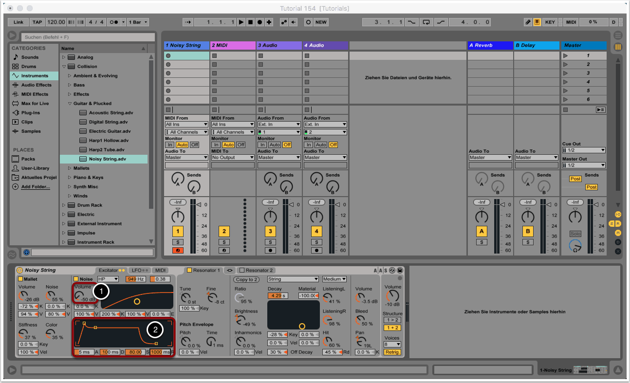 Aus dem Preset-Menü “Guitar & Plucked” wählen wir den Patch “Noisy String” aus und ziehen ihn auf das Collision-Modul. Das Preset bietet uns eine gute Basis für unseren Bass Sound (1).