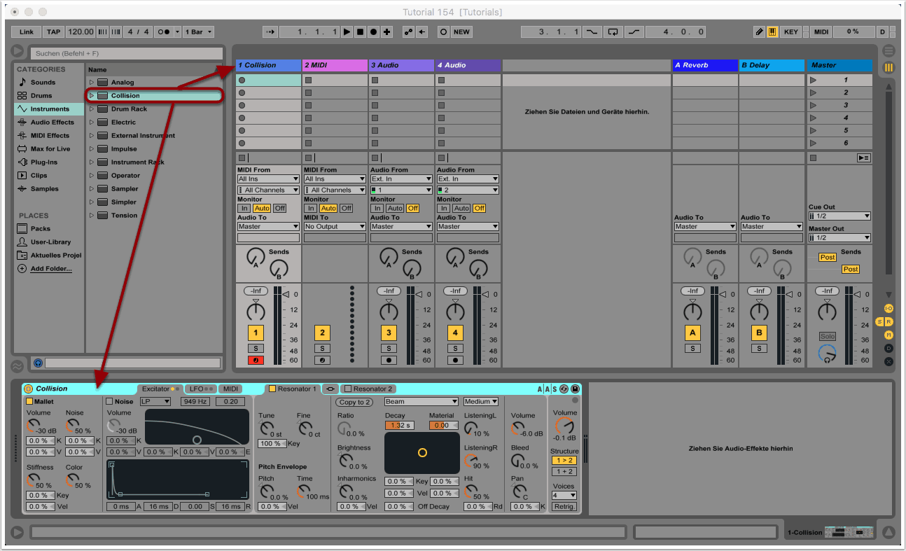 Im Instrumenten-Ordner wählen wir Collision aus und ordnen den Synthesizer per Drag&Drop einer freien MIDI-Spur zu.
