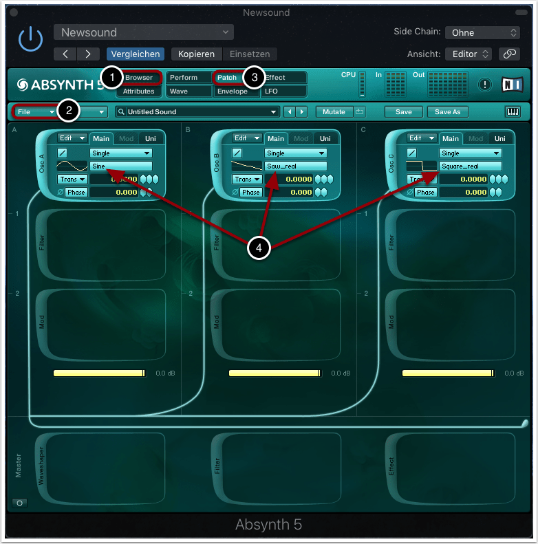Im Patch-Menü können wir die Einstellungen von bis zu drei Oszillatoren vornehmen (3).