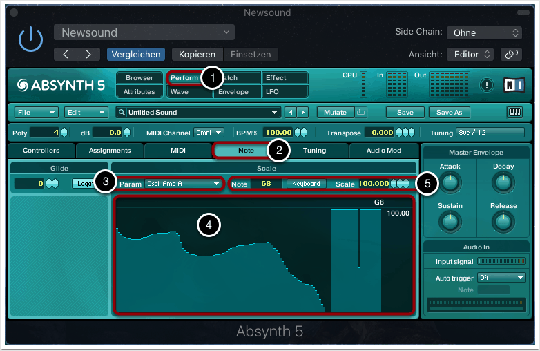Mit gedrückter Maustaste können wir den gewünschten Verlauf in den Mapping-Graphen einzeichnen. Auf der X-Achse sind die MIDI-Werte von C-2 bis G-8 zu sehen und auf der Y-Achse der prozentuale Anteil des ausgewählten Parameters (4).