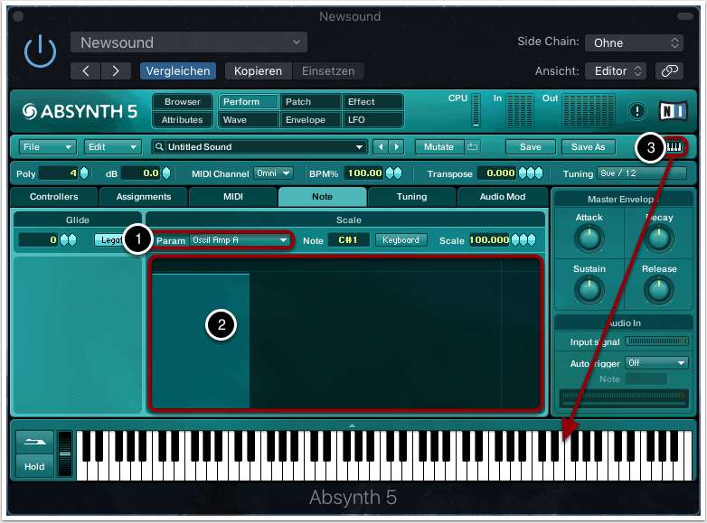 Für den Test sollte am besten ein externes MIDI-Keyboard mit einem großen Notenumfang verwendet werden. Sollte kein externes Keyboard verfügbar sein, kann auch die virtuelle Tastatur von Absynth verwendet werden, die über das kleine Tastensymbol aufgerufen werden kann (3).