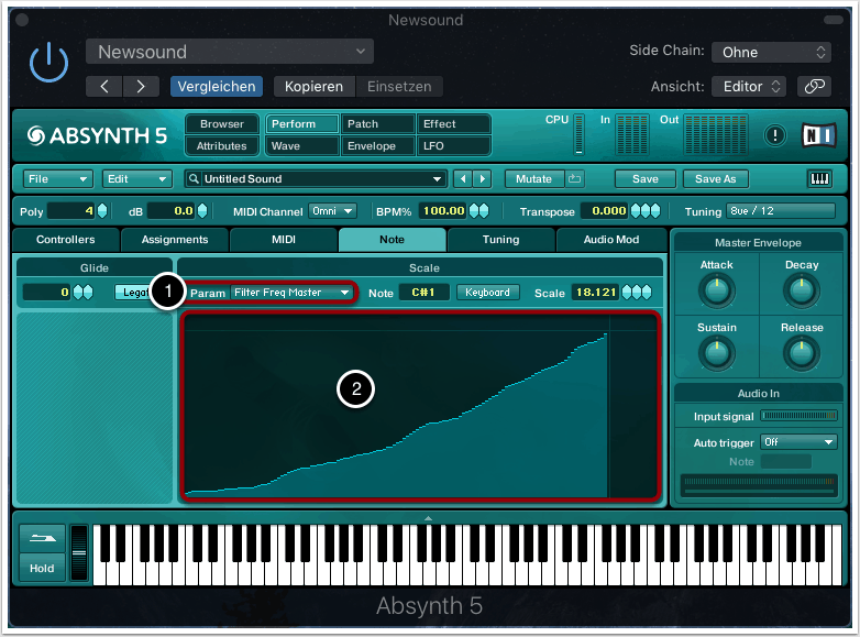 Im Note-Tab können wir das Key Scaling bzw. Note Mapping vornehmen (2).