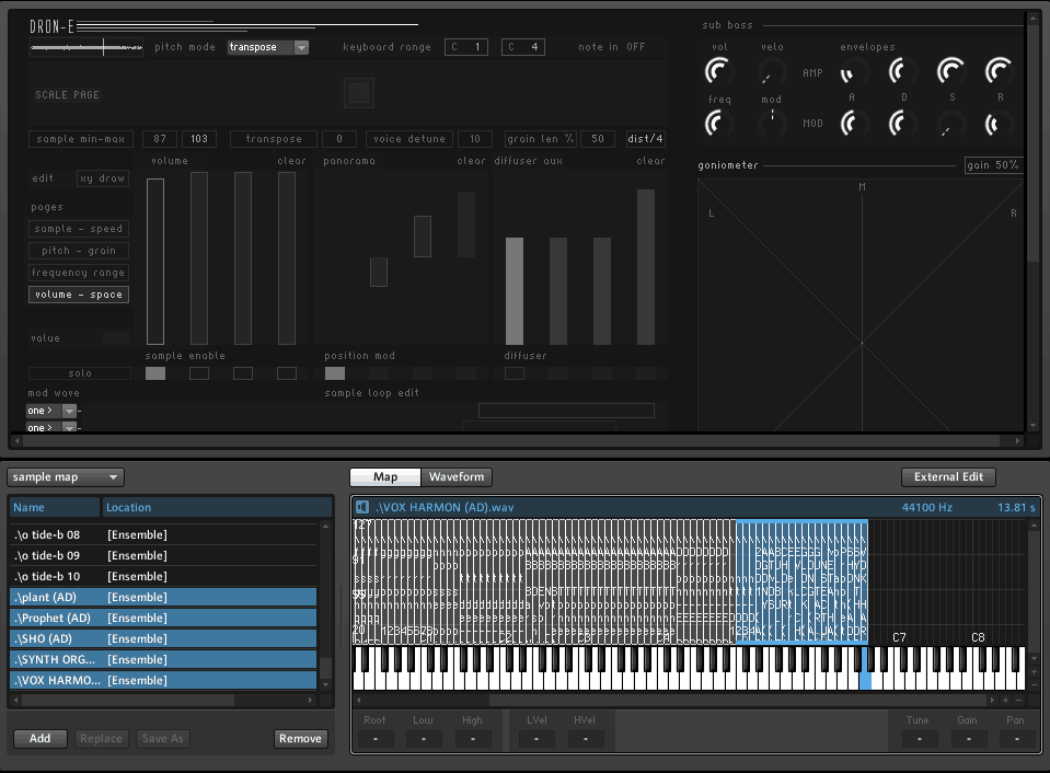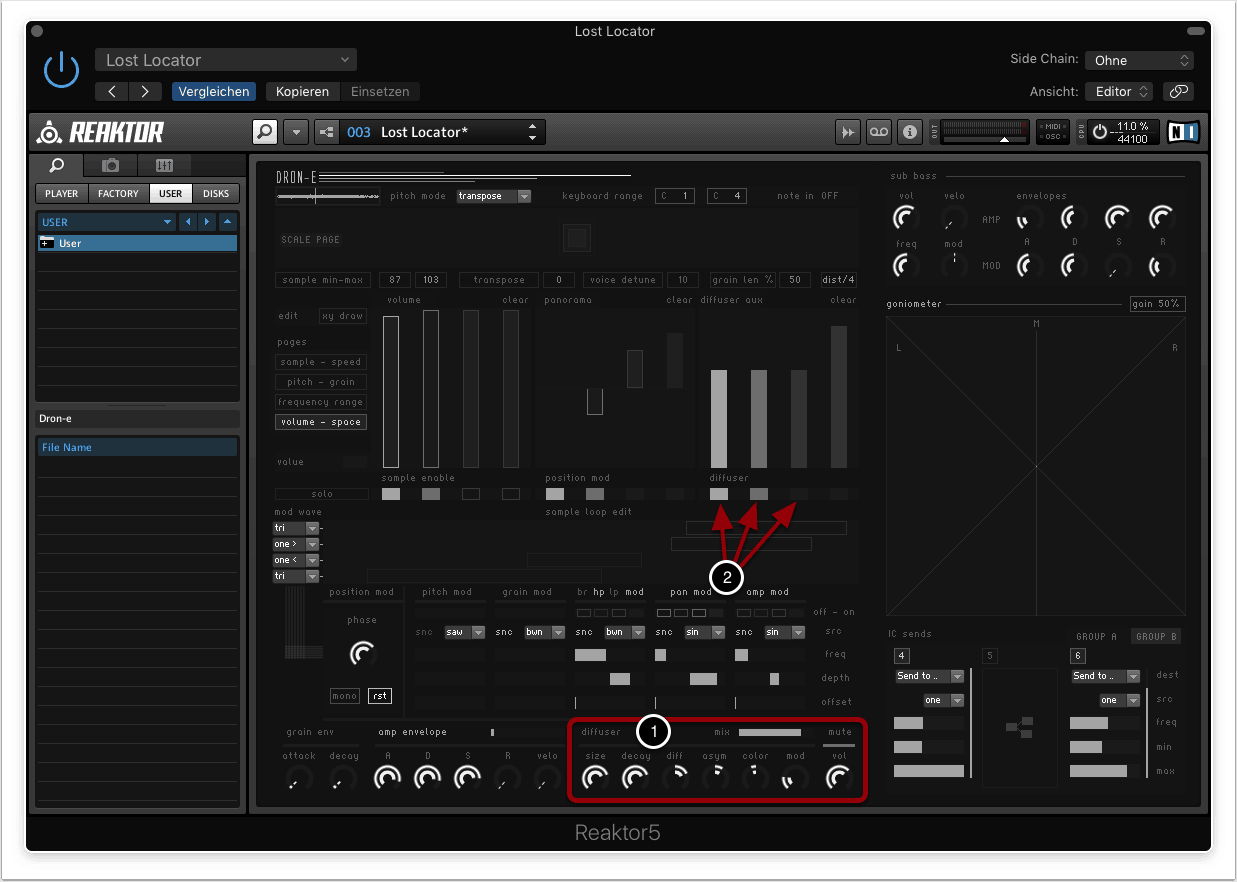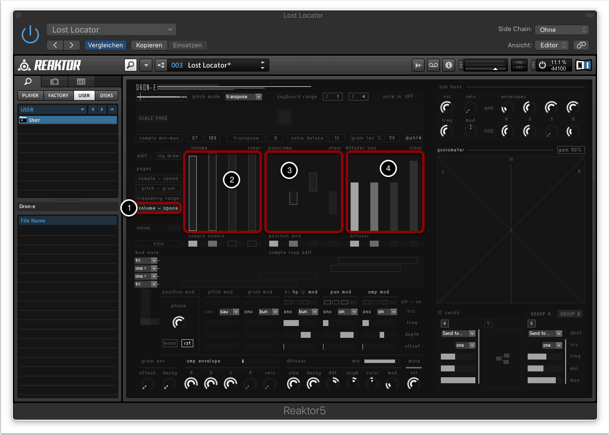 Per Default wird beim laden von Dron-e ein Patch geöffnet, der auf Samples aus der Dron-e Library basiert. Wie man eigene Audiofiles importiert und als Basis der Klangsynthese verwenden kann, wollen wir euch später zeigen.