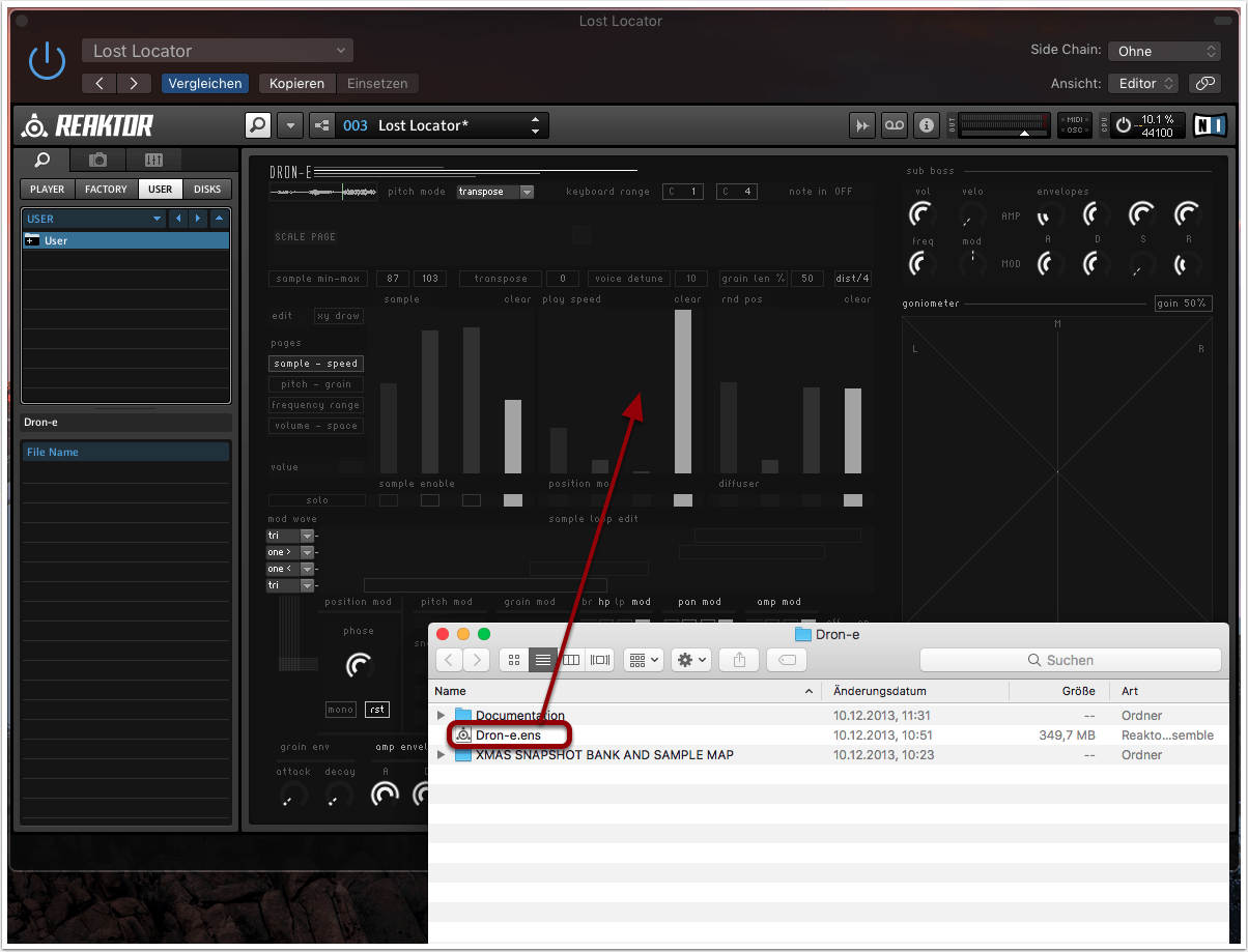 Wir entpacken den Dron-e-Zip-Ordner und ziehen das Dron-e-Ensemble per Drag&Drop in Reaktor.
