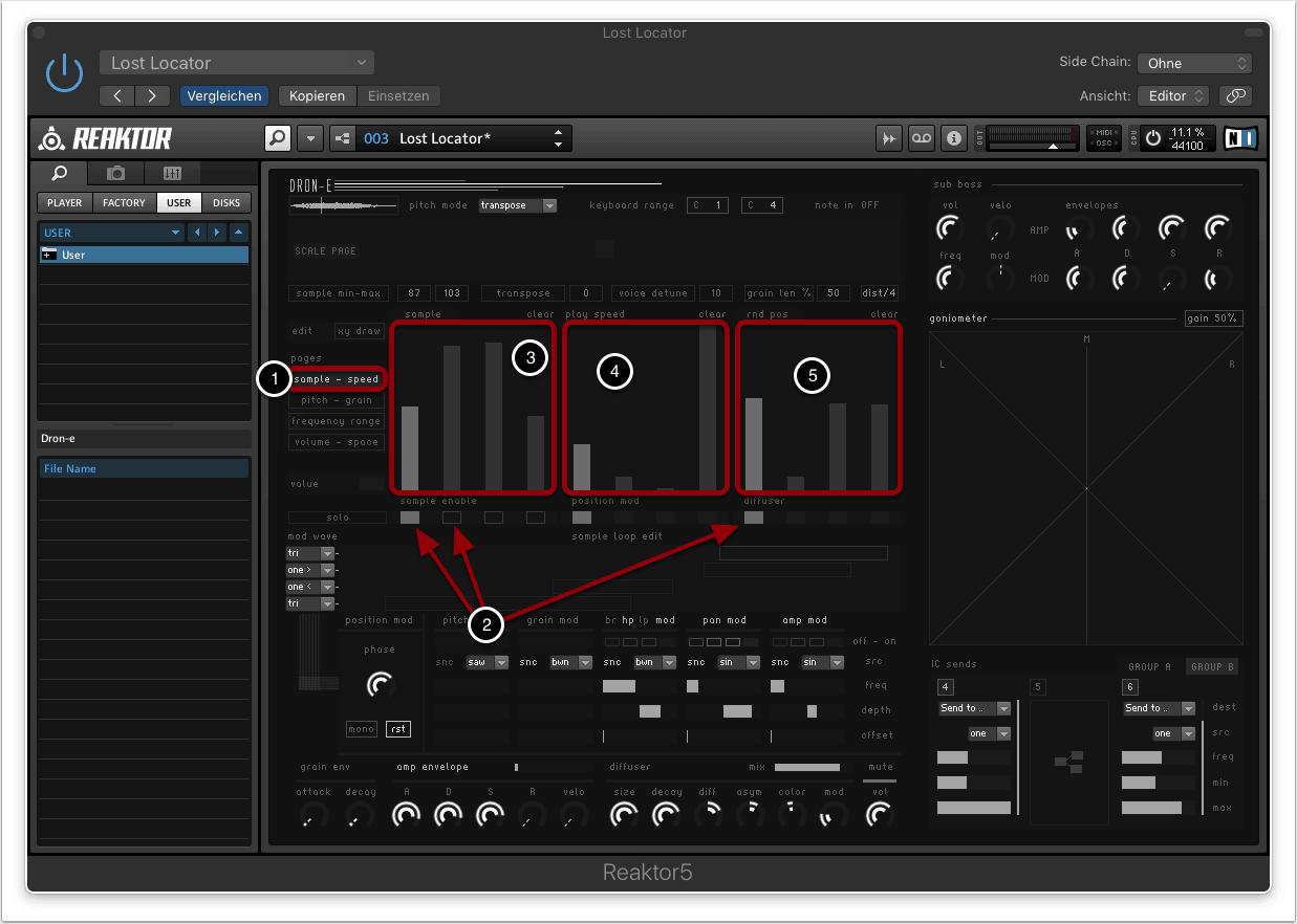 Mit “Grain Len” kann die Länge der Grains festgelegt werden. Höhere Werte resultieren in flächigen Klängen, niedrige Werte in perkussiven, abgehackten Sounds (3).