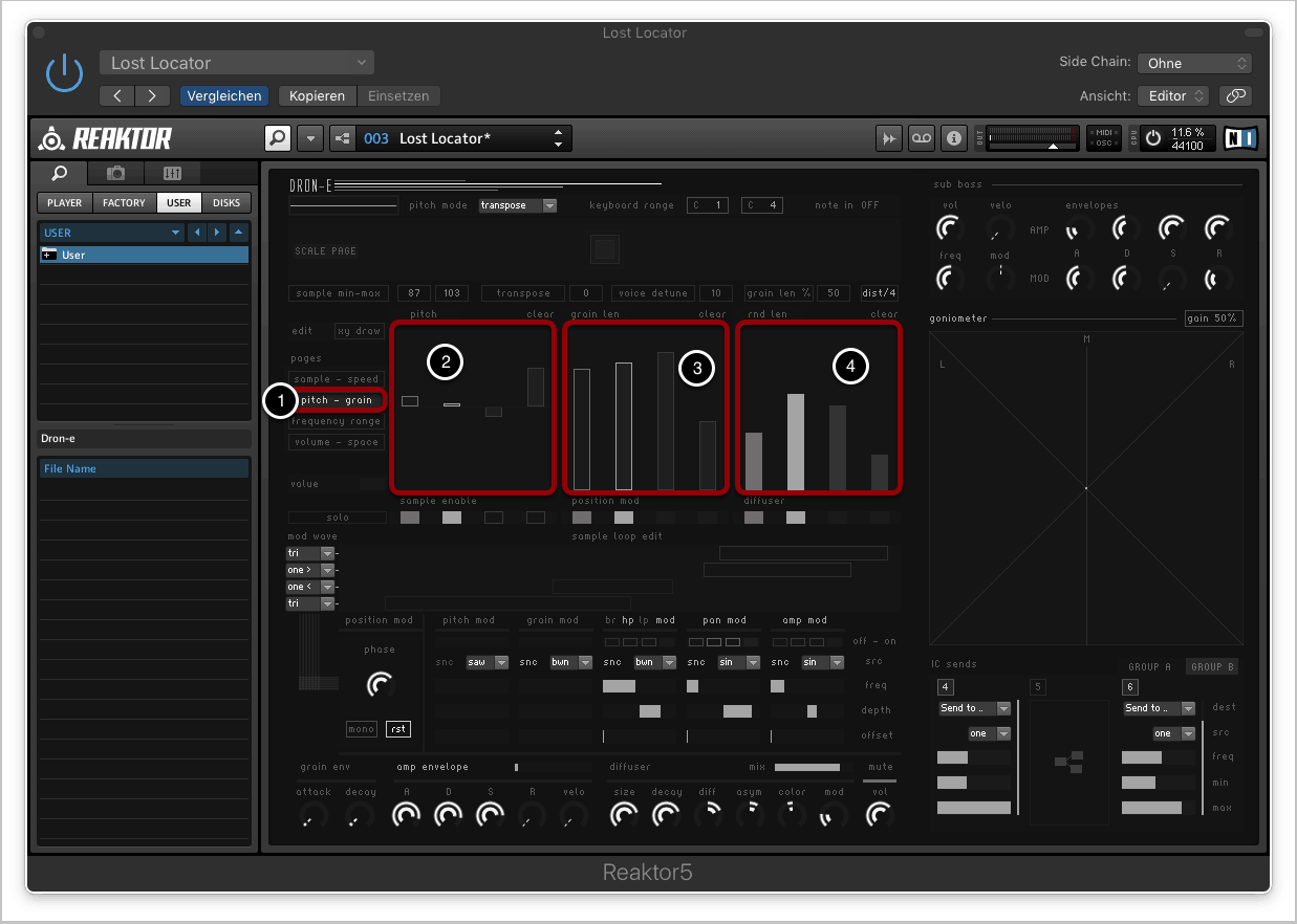 Im Pitch-Grain-Tab können die Tonhöhe sowie die Eigenschaften der Grains der verwendeten Samples festgelegt werden (1).