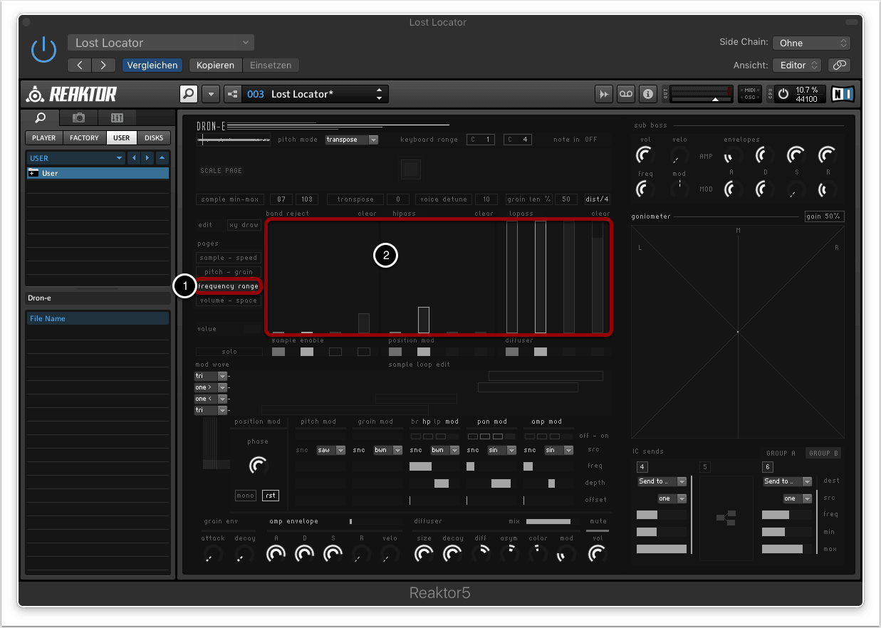 Im Frequency-Range-Tab kann die Bandbreite der verwendeten Sampels bestimmt werden (1).