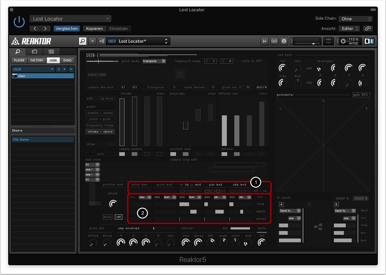 Dron-e funktioniert mit Native Instruments Reaktor ab Version 5.7.0. Mehr Informationen über Reaktor sind hier verfügbar.